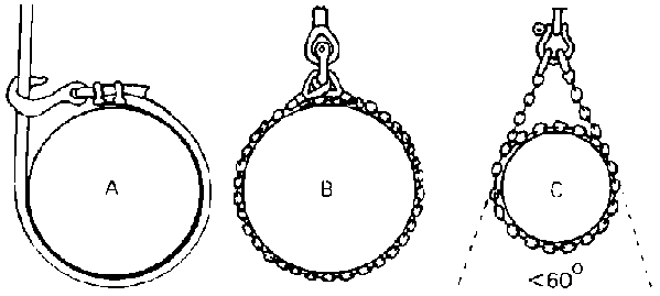 3. Modes d'attache d'un câble ou d'une chaîne sur un arbre. (A) Incorrect: boucle coulissante sur câble provoque des coques permanentes et endommage les torons du câble. (B) Incorrect: chaîne ajustée trop serrée provoque un effort excessif sur les manilles. (C) Correct: câble au chaîne faisant deux tours sur le tronc et relié à la manille selon un angle inférieur à 600.