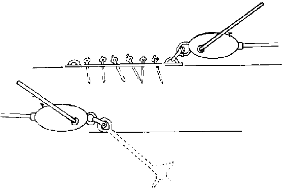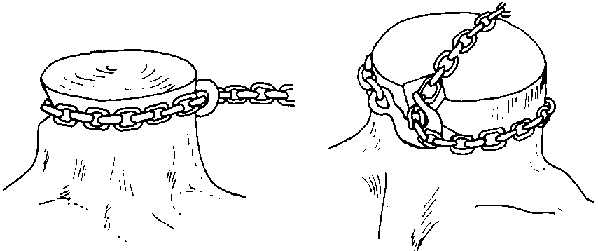 4. Rainure creusée sur une souche basse pour assurer la chaîne. (A gauche) chaîne avec crac étrangleur pour traction directe: (à droite) amarrage pour le basculement.
