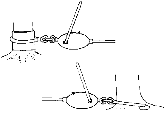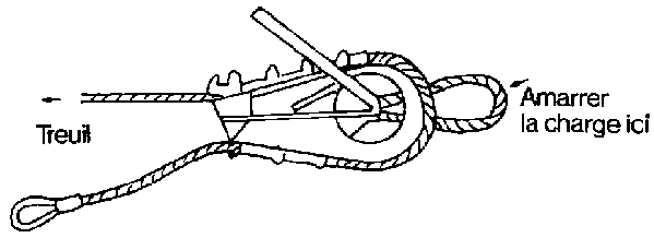 Lorsqu'on doit faire un amarrage provisoire à un câble, ou le raccourcir, on peut utiliser une cosse à blocage rapide (figure 9). Pour avoir une plus grande traction vers le haut, on peut utiliser un poteau à encoche ou un «chevalet de dessouchage» (figure 10).