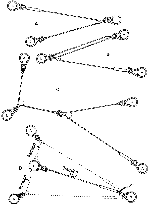 8. Utilisation d'arbres d'ancrage et de jeux de poulies pour (A) doubler (B) tripler et (C) quadrupler l'effort de traction du treuil sur l'arbre à abattre. Le dispositif (D) permet de changer la direction de l'effort de traction pour ébranler l'arbre sans changer la position du treuil.