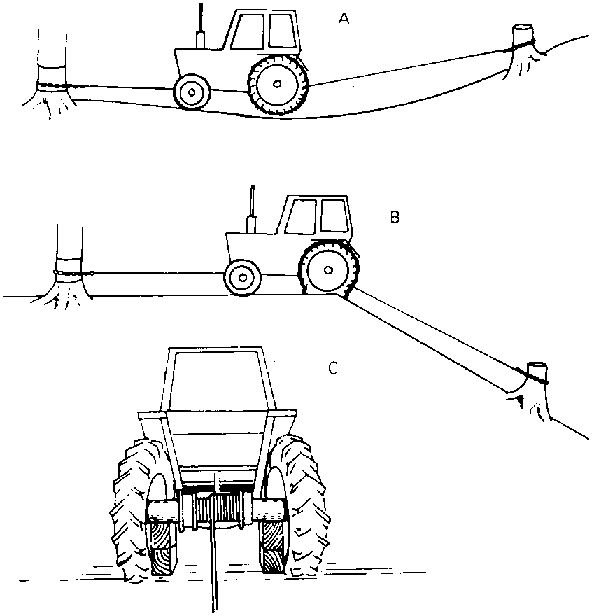 11. Positions dangereuses de treuillage avec tracteur. (A) Avec une souche située plus haut que l'arbre d'ancrage le tracteur perd contact avec le sol et peur se renverser. (B) Treuillage à partir d'un niveau plus élevé les pneus arrière sont soumis à une forte pression. Pour éviter des dégâts caler l'essieu arrière (C).