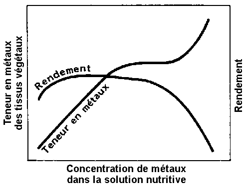 Bien que les plantes puissent acquérir des mécanismes de tolérance aux oligo-éléments, leur vigueur et leur productivité risquent néanmoins de se trouver sensiblement diminuées. Les figures 4 et 5 montrent d'une manière schématique les effets de concentrations d'oligo-éléments métalliques dans la solution nutritive sur le rendement et sur la teneur en métaux des tissus des plantes.