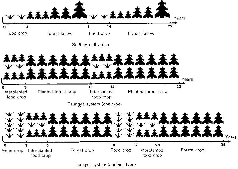 · Swidden or shifting cultivation is the oldest known agroforestry practice, dating back to the beginnings of the human transition from the hunting and gathering phase to the plant domestication and cultivation system of livelihood (Myers, 1980). The forest Is cut, dried and burnt to clear the land for planting and to return the nutrients trapped in the forest biomass to the soil to be used by the food crops. Cropping lasts for about two to three years, after which the land is left over a longer period (eight to ten years) to forest fallow in order to rejuvenate the soil (Fig. 1a) and to prepare it for the next cycle of burning and cropping (Sanga, 1978).· Taungya, which had its origins in Burma in the mid-1880s, was the first "modern" (as opposed to "traditional", as in swiddening) agroforestry practice, it was designed as a low-cost governmental approach to the reforestation of open lands. Farmers are temporarily allotted government lands and contracted to plant desired tree species. While the trees are young and before the canopies close (one to three years, depending on the initial spacing and the inherent crown structure of the tree species), the farmers are allowed to plant food crops whose yields become theirs entirely and are regarded as their compensation for planting the trees. When food cropping is no longer possible, because of shading, the farmers are transferred to another open area where they repeat the process. Meanwhile, the "abandoned" area is by then a well-established forest and will not be cultivated for annual food crops again until the planted trees reach maturity and are harvested.