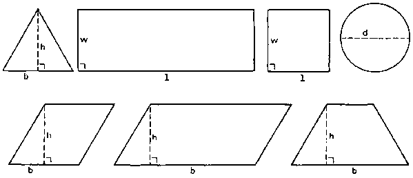 In the case of a square or a rectangle, the expression length (1) is commonly used instead of base and width (w) instead of height. In the case of a circle the expression diametre (d) is used (see Fig. 1b).