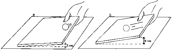 A cardboard sheet is lifted on one side 2 cm from the ground (see Fig. 79a). A small ball is placed at the edge of the lifted side of the sheet. It starts rolling downward, following the slope direction. The sheet edge is now lifted 5 cm from the ground (see Fig. 79b), creating a steeper slope. The same ball placed on the top edge of the sheet rolls downward, but this time much faster. The steeper the slope, the higher the velocity of the ball.