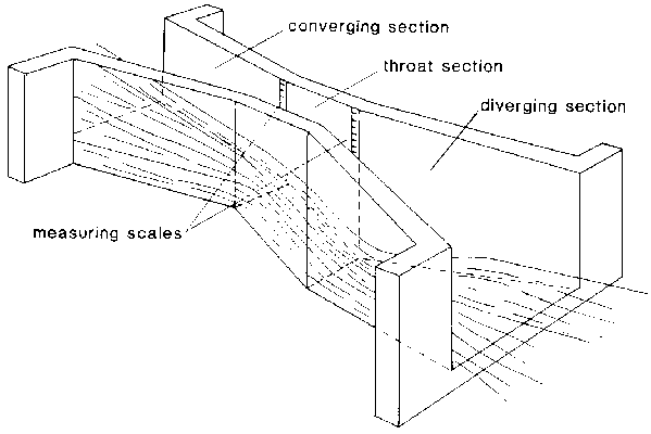 The Parshall flume consists of a metal or concrete channel structure with three main sections: (1) a converging section at the upstream end, leading to (2) a constricted or throat section and (3) a diverging section at the downstream end (Fig. 88).