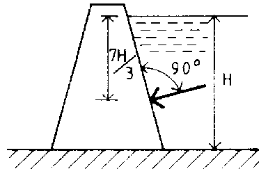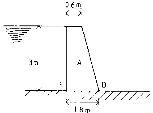 Consider a mass concrete dam with the cross section shown which retains water to 3m depth. Assume: Ground safe bearing capacity 300kN/m². Coefficient of sliding friction at base 0.7. Specific weight of concrete 23kN/m³.