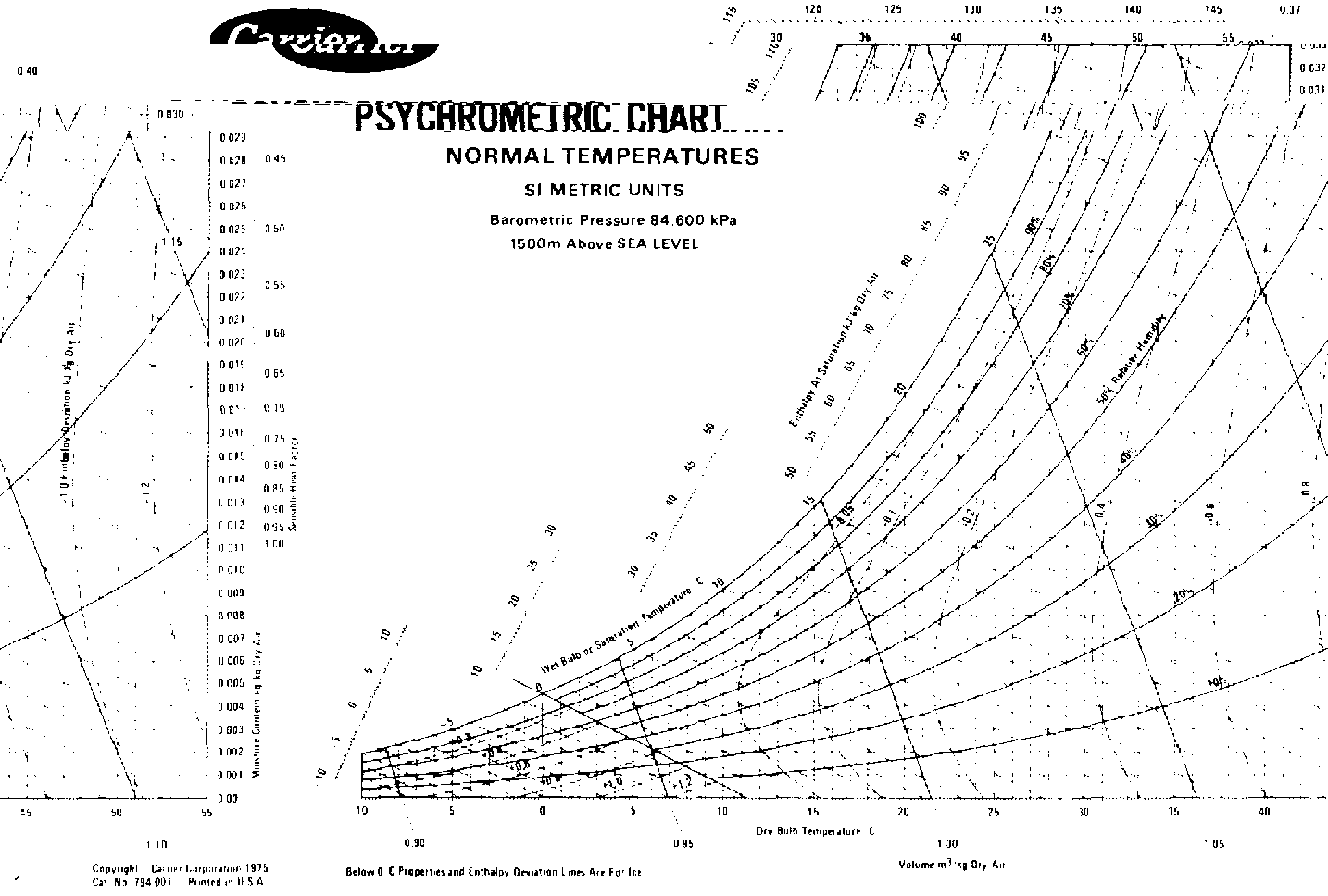 A psychrometric chart (Figure 7.2 and appendix V:4-6) is a graphical representation of the thermodynamic properties of moist air. It is useful for solving engineering design problems. Charts for agricultural applications are usually corrected to standard atmospheric pressure of 101.325 kPa. However charts for other elevations are available. The following properties are shown on a psychrometric chart: