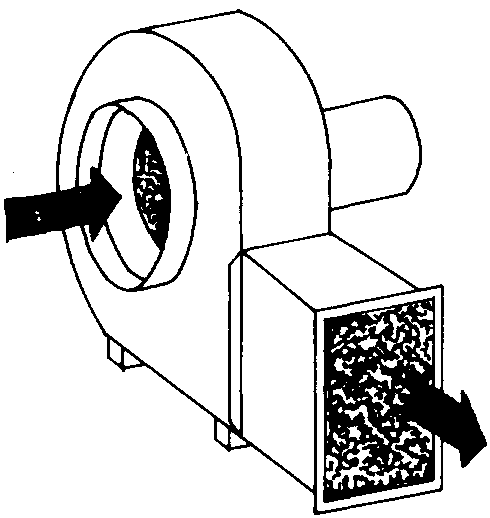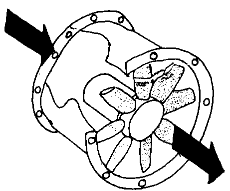 Centrifugal (radial-flow)fans are used for ducted installations or where air must be moved through a product such as grain or potatoes. The blades on the blower may be radial, e.g., straight from the shaft, curved forward in the direction of rotation, or curved backward opposite to the direction of rotation. The latter can achieve the highest efficiencies under high-pressure performance and are most suitable for agricultural applications. The most important attribute of the backward-curve blower is its nonoverloading characteristic. Both the radial and forwardcurved types require their greatest power input when air flow is cut off. An air blockage therefore, is likely to overload the motor and cause damage. Figure 7.7.