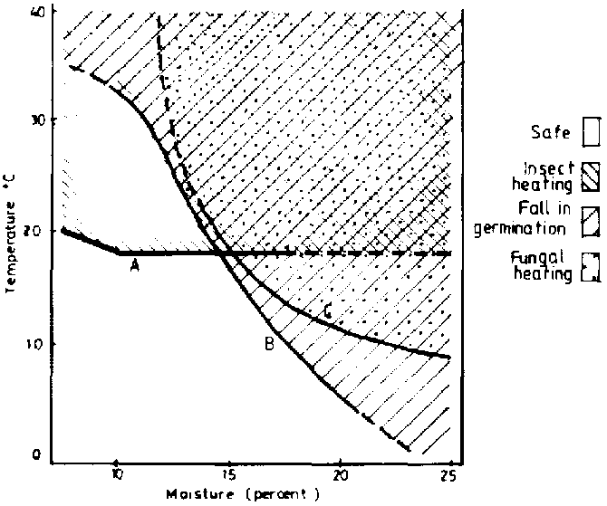 The relationship between moisture content and temperature on the storability of crops is shown in Fig. 9.1. It can be seen that the moisture content of grain must be reduced at higher temperatures.