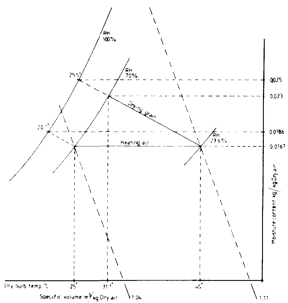 Example: The ambient air at 25°C and 70% RH is heated to 45°C and 24% RH. Then upon passing through the grain, it gains enough moisture to again reach 70% RH while the temperature drops to 30.1° C. Then each kg of air will have removed (0.0230.0167) = 0.0063 kg of moisture. Whether the air returns to 70%, RH or some other level, will depend on air velocity through the grain