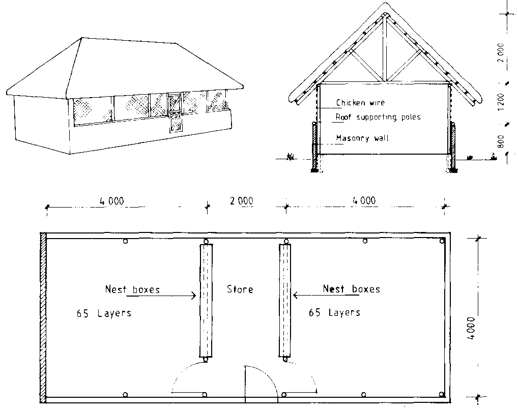 A small house of this type with slatted floor is shown in Figure 10.41. Alternatively wire mesh can be used for the floor. It is built on treated wooden piers 0.8 to 1m above the ground. Ventilation and manure removal are both facilitated, no litter is required and bird density can be 6 to 8 per m². Feeding, watering and egg gathering are all efficiently handled from the outside. Either a double pitch thatch roof or a single pitch corrugated steel roof may be installed with the eaves about 1.5m above the floor. If the latter is used, some insulation under the roof is desirable. The feed troughs should be equipped with hinged covers and rat guards should be installed at the top of each pier. The width of this type of building should be limited to about 2m to allow easy removal of manure and adequate wall space for feed and nests. The building should be oriented east and west and may be of any length. However, if it is more than 5m long, nests will need to be put on the sides and all remaining wall space on either side used for feeders in order to allow the required 100mm/bird. See Table 10.13.