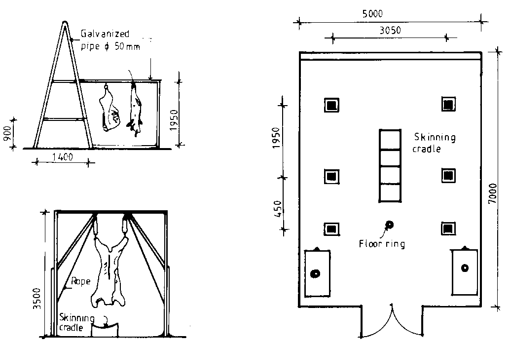 After an initial installation of a gantry hoist, concrete slab and metal roof, the facility can be gradually converted to an economical, low through-put slaughterslab. There should be floor rings to hold animals, skinning cradles for cattle and small stock, rails for hanging the carcasses and an adequate and convenient water supply.