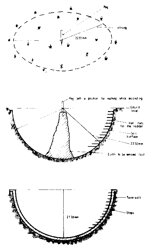 The site for a tank of this size must be on firm ground with a reinforced concrete base. If the original ground is sloping, it is necessary to dig out the high area but not fill in the low side.