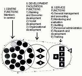 2.3.2 Development facilitation functions. If the situation of the poor is to be met effectively, three inter-related processes have to be set in motion. We characterize these processes as three functions which serve to facilitate the development the landless poor endeavour to achieve through their work. These are: the banking and economic development function which makes credit available, the social development function which makes information and supplies available, and the organization development function which engages in development and management of the socio-economic formation as a whole. This aim is to ensure that the Bank is appropriate for its purpose of serving the poor.