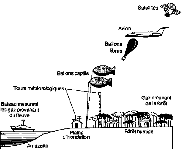 Pour le projet de recherche du bassin de l'Amazone, au Brésil, des instruments sophistiqués on? été utilisées sur l'eau et à terre, ainsi que dans les couches inférieure et supérieure de l'atmosphère, pour mesurer l'influence de la forêt humide sur la chimie de l'atmosphère.
