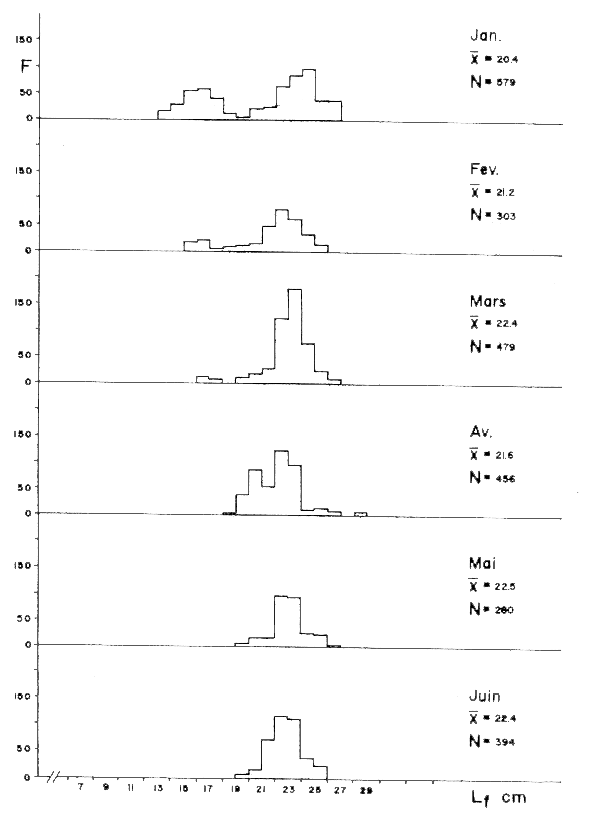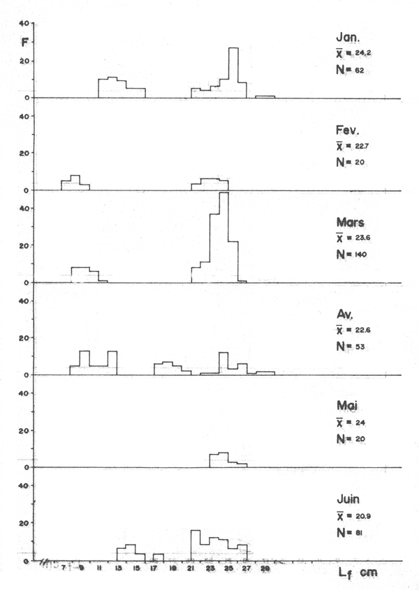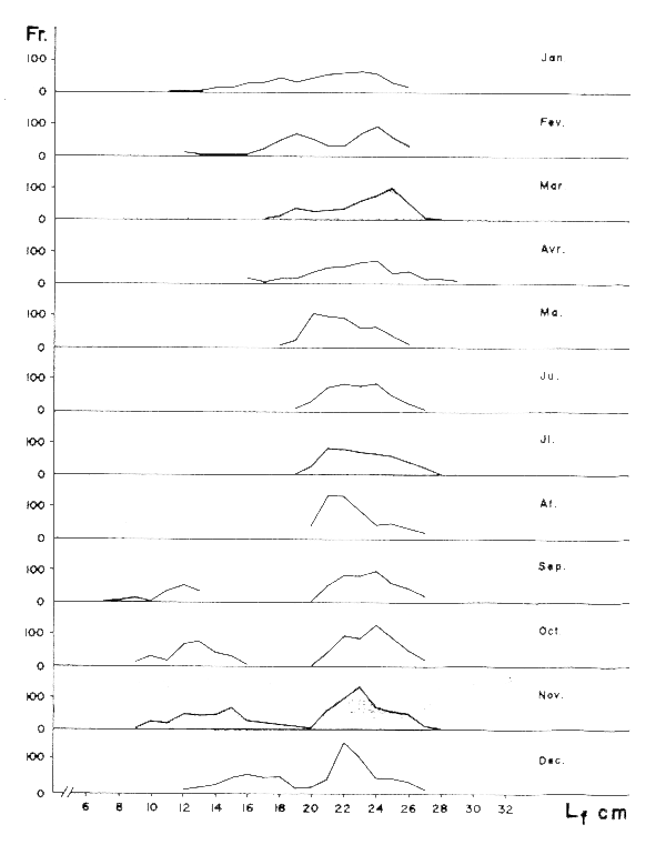 Les données de taille/fréquence pour cette espèce sont présentées dans la figure 3. C'est une espèce qui se reproduit pendant toute l'année et qui se déplace le long des côtes selon les variations de température (FAO, 1978). C'est pour cette raison que l'on peut trouver de petits exemplaires pendant toute l'année et dès lors il devient difficile d'établir un critère sur l'époque de recrutement.