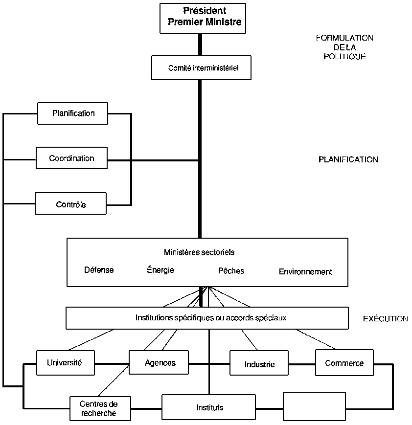 A ces remarques générales on peut ajouter que toute politique devra être énoncée clairement, afin d'être comprise par l'ensemble de la population et de bénéficier du soutien nécessaire à sa mise en œuvre. Il en sera ainsi en particulier lorsque son exécution requerra une participation multiple, soit dans le domaine organique (instituts de recherche, entreprises publiques ou privées), soit dans le domaine administratif (région, département, ville). Il sera essentiel d'assurer un flux constant d'information entre les différents niveaux institutionnels. Partant de la base (par exemple instituts de recherche ou universités), on devra s'assurer que toutes les informations parviendront au sommet (par exemple au centre de planification marine) et, à l'inverse, une fois la décision politique prise (par exemple par le comité interministériel), il faudra qu'elle soit expliquée et détaillée aux organes d'exécution sectoriels (par exemple un centre hydrographique).