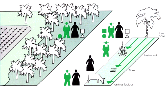 In Pananao, the control of, responsibility for, an labour involved in exploiting the palm tree var according to the parts of the tree being uses men use the wood for construction, women us the fibre in handicrafts, and both men an women use the tree's products for anima fodder. Furthermore, the division of control, responsibility and labour shifts with place an activity: near the homestead, only women are involved and on pasture land men exercise a three functions exclusively but for the collection of fuelwood: the divisions are mixed on cropland, where women contribute labour, and on forest `remnants'- areas of previously over-exploited forest- where women are given responsibility for the trees and provide the labour but men have control of the resource.