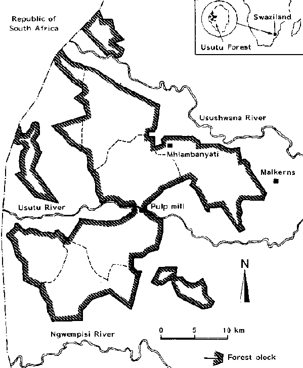 The Usutu forest is an area of 52000 ha of predominantly pine plantations in the high veld of Swaziland in southern Africa (see Fig. 1). These man-made plantations supply the raw material for the annual production of about 180000 tonnes (air-dry) of unbleached Kraft wood-pulp produced in a mill situated in the middle of the forest beside the Usutu river. The pulp is exported throughout the world and, after sugar, is Swaziland's most important export. Manufacture of pulp from this project has continued uninterrupted for 25 years and, as an economic activity, generally represents about 20 percent of the nation's exports and about 12 percent of GNP. The enterprise is owned jointly by the Commonwealth Development Corporation and Courtaulds Ltd with holdings by the Swazi government.