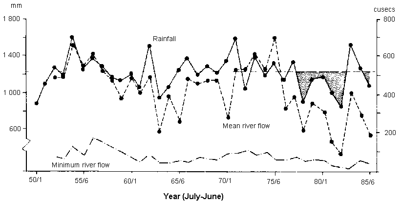 No data exist for the Usutu forest's possible effects, although weir GS9, about 8 km south of the mill site, monitors flow rate. Seasonal How closely matches rainfall (see Fig. 2), but total effects are difficult to disentangle from annual rainfall patterns, which have been below average in recent years as in most of Africa, and the fact that winter How rates have been affected by the construction of storage dams, afforestation and urban water needs across the border in South Africa.