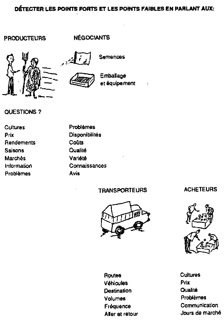 L'agent de vulgarisation devra se familiariser avec les problèmes et les débouchés (ou principaux points de vente) de la zone. On trouvera ci-après une liste des questions auxquelles il devra répondre.