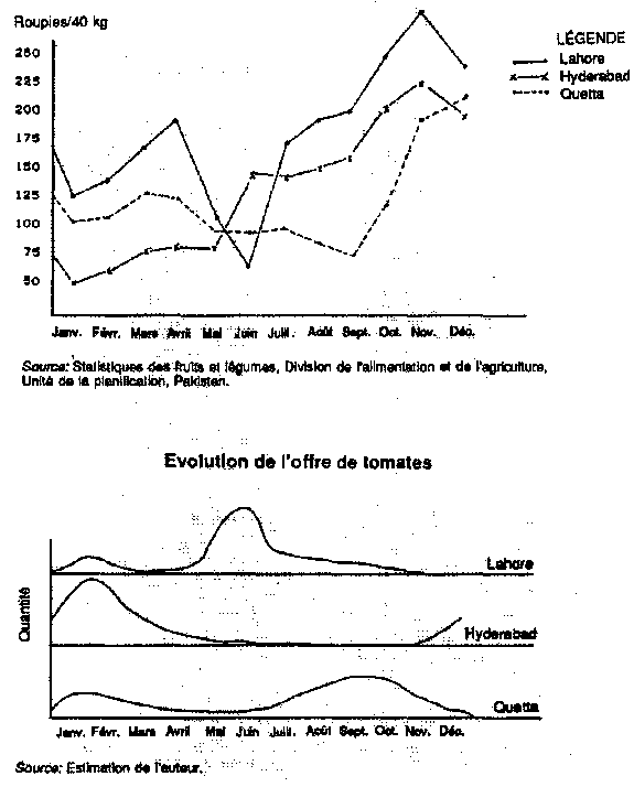 Parfois, on peut déduire la courbe de l'offre de celle des prix. Le graphique 4 (voir Graphique 4.Comparaison du prix moyen des tomates lé 1979180 à 1984/85 sur trois marchés de gros) mnntre le prix des tomates dans trois grandes zones du Pakistan où les climats sont différents. A Haidarabad, dans le Sind, l'hiver est assez chaud pour que les tomates mûrissent: les ventes atteignent un maximum en janvier et février. Une partie est expédiée à Lahore et Quetta, ce qui explique la baisse de prix à ce moment-là. ALahore, dans le nord du Panjab, la récolte principale de tomates a lieu en mai et juin (plantation après les gelées d'hiver). Plus tard, il fait trop chaud. Quetta, ville du Baluchistan, est située en altitude; les tomates mûrissent à la fin de l'été, en août et septembre. Les prix très élevés sur tous les marchés en novembre et décembre indiquent qu'il y aurait là une place à prendre pour des producteurs jouissant du climat et de la technologie voulus et situés pas trop loin.