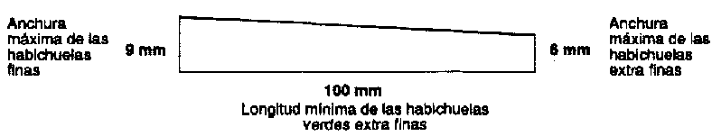Existen especificaciones estrictas en cuanto al tamaño de las habichuelas verdes finas y extra finas. Las extra finas deben ser de longitud superior a los 100 mm pero de menos de 6 mm de ancho, mientras que las finas deben tenermenos de 9 mm de ancho. Para quelas nuevos trabajadores encargados de la clasificación pudieran verificar esos tamaños al comienzo de la temporada, se prepararon modelos de 100 mm de largo, y de 9 mm de ancho en una punta y 6 mm en la otra (véase figura pág. 30). Los modelos podían ser de estaño, madera o cartón y se distribuían a los nuevos recolectores para que midieran las habichuelas y las clasificaran correctamente según su tamaño.