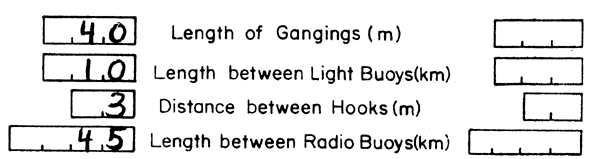 18.  Record the length of the gangions in metres. The length between light abd radio buoys is recorded in metres.