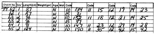 2.   Record the sex, length in centimetres, and if required, weight in grams, for each fish from which otoliths were taken. Use the numerical code for sex, 1 male, 2 female, 0 unsexed. Remember to indicate whether or not the otolith has been successfully taken by entering Y (yes) or N (no) in the age column. Notice in the example below that the otoliths for fish No. 5 were either not found or inadvertantly discarded. The other information is still valid however.