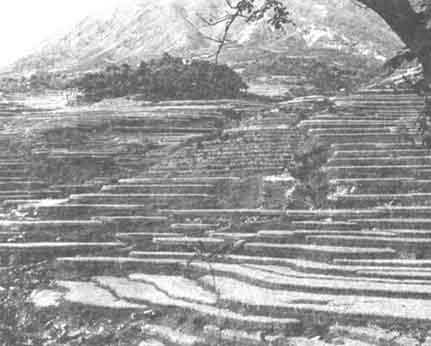 Basins are flat areas of land, surrounded by low bunds (see section 2.2.2). The bunds prevent the water from flowing to the adjacent fields. Basin irrigation is commonly used for rice grown on flat lands or in terraces on hillsides (see Figure 2a). Trees can also be grown in basins, where one tree is usually located in the middle of a small basin (Figure 2b). In general, the basin method is suitable for crops that are unaffected by standing in water for long periods (e.g. 12-24 hours).