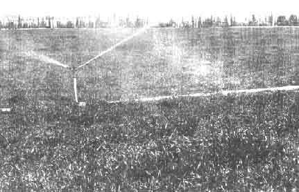 Sprinkler irrigation is similar to natural rainfall. Water is pumped through a pipe system and then sprayed onto the crops through rotating sprinkler heads.
