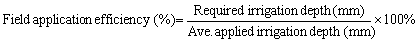 The field application efficiency is the fraction of the applied water that is used by the crop. Provided there are no runoff losses, the field application efficiency (%) is the required irrigation depth (mm), divided by the average applied irrigation depth (mm), multiplied by 100%. | ||