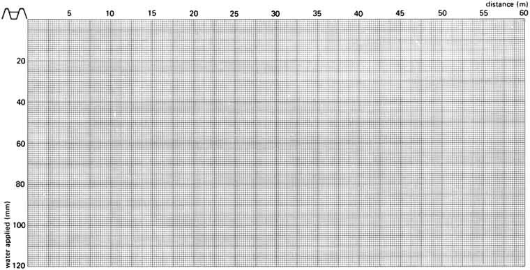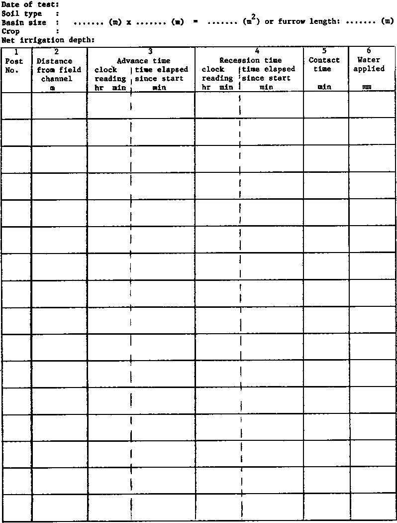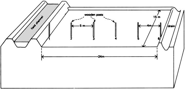 Now the irrigation starts. Use the same stream size and the same irrigation time as the irrigator normally uses. Record the time it takes for the water front to reach each wooden post (1 to 6). This is called the advance time: column 3. | ||