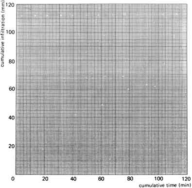 Calculate at each of the wooden posts the amount of water applied, using the infiltration curve: in this case Figure 76: column 6. All data are recorded on the data sheet as indicated in the example below. | ||