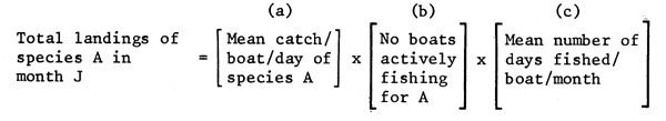 For a given uniform type of vessel and fishing method, the landings in a month J of species A on a given ground can then be obtained from: