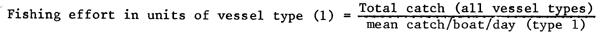 (2) Fishing effort: given one or more uniform boat types fishing the same fishing gear, one category can be chosen as standard, and the total effort exerted by all vessel categories per month can be obtained from an estimate of its landings per month, as follows: