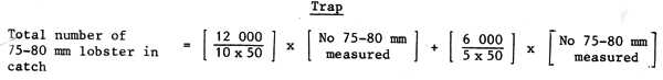 Although not required for all analyses, size frequencies can be “weighted up” to give the estimated size composition for the whole monthly commercial catch of 18 000 kgs. This is done, size category by size category, as follows (for example, the spiny lobster length group 75–80 mm carapace length):