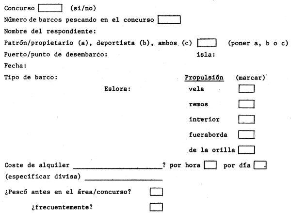 Este apéndice trata de los cuestionarios y fuentes de documentos utilizados para la recolección de varios tipos de datos relacionados con las pesquerías. Estos formularios deberán ser modificados a la luz de las necesidades especiales y las condiciones locales, y su finalidad fundamental es ayudar en la planificación de encuestas para fines especiales. La descripción de las disciplinas y análisis para los que se destina la recogida de los datos incluidos en estos formularios excede del objetivo del presente documento, y tampoco es nuestra intención dar prioridades a las diversas disciplinas implicadas. Antes de comenzar a hacer un uso completo de uno u otro formulario, será aconsejable buscar el asesoramiento de un experto en el campo en cuestión, particularmente desde el momento en que es necesario establecer un diseño de encuesta estadística. No obstante esta condición, los tipos de formularios incluidos en este apéndice, y los tipos de información que están destinados a registrar, tienen una utilidad obvia para cualquier persona interesada en el campo de las pesquerías, y pueden ser utilizados, después de hacer adaptaciones locales, para la recogida de información de tipo indicativo, o para encuestas en pequeña escala previas a encuestas en gran escala.