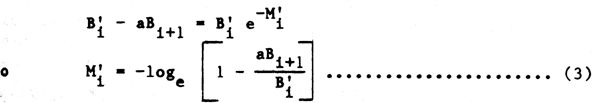 Al final del intervalo de tiempo, ignorando los efectos del crecimiento de depredadores y presas, la biomasa original de la presa B'i se reduce a (B'i - aBi+1), y la correspondiente tasa de disminución de biomasa por depredación M'i será: