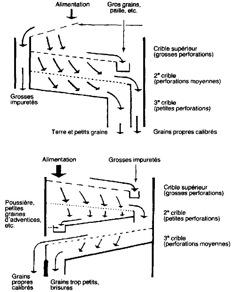 12.2.1 Tamisage. Les impuretés sont séparées des grains du fait de leurs dimensions différentes. Les cribles manuels sont généralement utilisés seuls, tandis que la plus simple des machines aura deux cribles - l'un avec de grosses perforations (qui laisse passer les grains et retient les grosses impuretés), l'autre avec de petites perforations (qui retient les grains, mais laisse passer les petites impuretés).