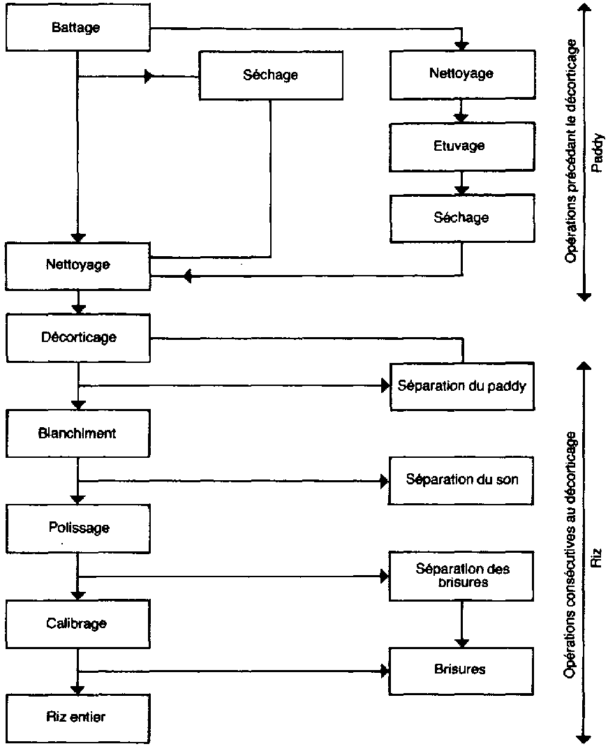 Les différentes étapes du traitement du riz sont représentées à la figure l 3. l, depuis la récolte des panicules jusqu'à la production d'un riz blanc, poli et calibré.