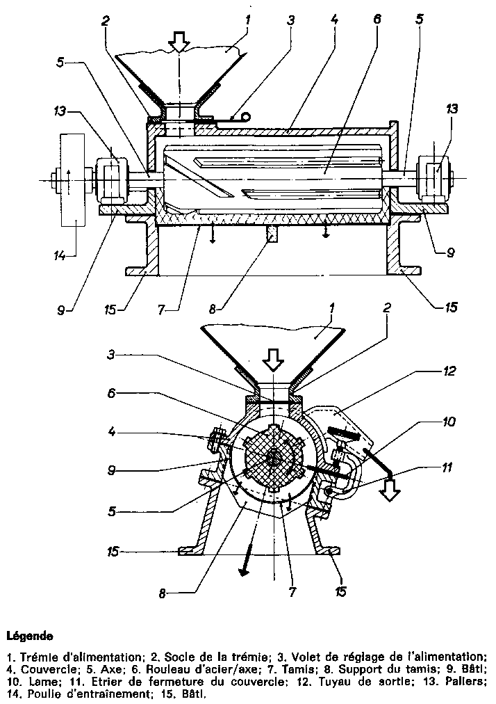 Le moulin à cylindres est un appareil plus sophistiqué que le moulin à meules ou le moulin à marteaux; il produit une farine fine de grande qualité, surtout de blé, mais aussi de mais et de sorgho.