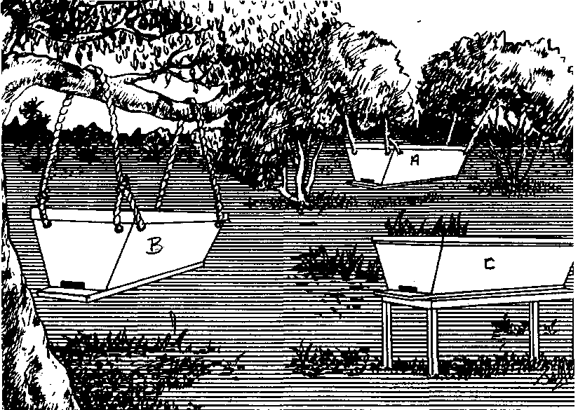 Use the suspension wire to hang the hive as shown at (,) in Fig. 9. The hive should tilt slightly, with the entrance down, so that any water entering the hive can trickle out. It should be parallel with and one metre above the ground. Study Fig. 9; only hive (A) is correctly installed. It is hanging from two strong and sturdy branches, and each of the four suspension wires is attached separately. Hive (B) is nicely hung parallel to the ground, but the wires on each side are joined and hang from only two points on the same branch. The other subsidiary branches were ignored. In a strong wind, hive (A) will never tip over, but hive (B) will dangle and tip over, and all the contents may be lost. Further, the top cover of the hive should always be unobstructed to facilitate its removal and replacement. The stand for hive (C) has no lizard guards.