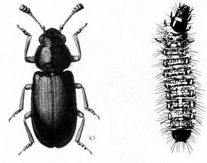 LARVE - Aspect: voir figure 1 (à droite). Larve typique de coléoptère à trois paires de pattes articulées; modérément poilue. Le corps est essentiellement gris crème, avec des taches gris violet sur le dos. La tête et les faces dorsales du premier segment thoracique et du dernier grand segment abdominal (le neuvième), portent des plaques brunes durcie; les deuxième et troisième segments thoraciques portent aussi de petites plaques brunâtres. Il y a aussi une plaque sur le dernier grand segment abdominal, qui porte deux protubérances en forme de cornes, fortement relevées vers le haut. Il est très difficile de distinguer cette espèce des cléridés étroitement apparentés, mais on la reconnaît facilement des larves de Dermestes par la coloration et par la quantité normale de soies, et des larves de mouches par la présence de pattes et d'une tête bien visible.