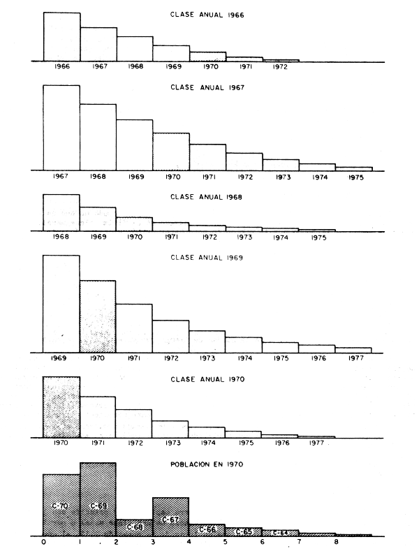 de donde podemos concluir que cuando el reclutamiento es constante, y siempre que la mortalidad sea también constante, la población en un momento dado tiene el mismo tamaño y la misma estructura que una sola clase anual a lo largo de toda su existencia. Hecho que se ha tratado de ilustrar en el ejemplo de la fig. 3.1, y que en la práctica permite que la estructura de la población en un momento dado pueda ser averiguada si se conoce la historia de una sola clase anual, y viceversa, es decir, si esta condición se oumple, es posible también conocer la historia de una clase anual (incluyendo la sobrevivencia y el crecimiento) a partir de la estructura que tiene la población en un momento dado.