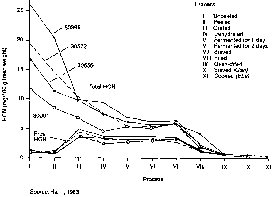 Traditional processing and cooking methods for cassava can, if efficiently carried out, reduce the cyanide content to non-toxic levels. An efficient processing method will release the enzyme linamarase by disintegrating the microstructure the cassava root. On bringing this enzyme into contact with linamarin the glucoside is converted into hydrogen cyanide. The liberated cyanide will dissolve in the water when fermentation is effected by prolonged soaking, and will evaporate when the fermented cassava is dried. Sun drying fresh cassava pieces for short periods is an inefficient detoxification process. Cyanide will not be completely liberated and the enzyme will be destroyed during drying. Sun drying processing techniques reduce only 60 to 70 percent of the total cyanide content in the first two months of preservation. Cyanide residues can be quite high in the dry tubers, from 30 to 100 mg/kg (Casadei, 1988). Simple boiling of fresh root pieces is not always reliable since the cyanide may be only partially liberated, and only part of the linamarin may be extracted in the cooking water. The reduction of cyanides depends on whether the product is placed in cold water (27°C) or directly into boiling water (100°C). After 30 minutes cooking, the remaining cyanides are, in the first case, 8 percent of the initial value, and in the second case about 30 percent (Easers, 1986).