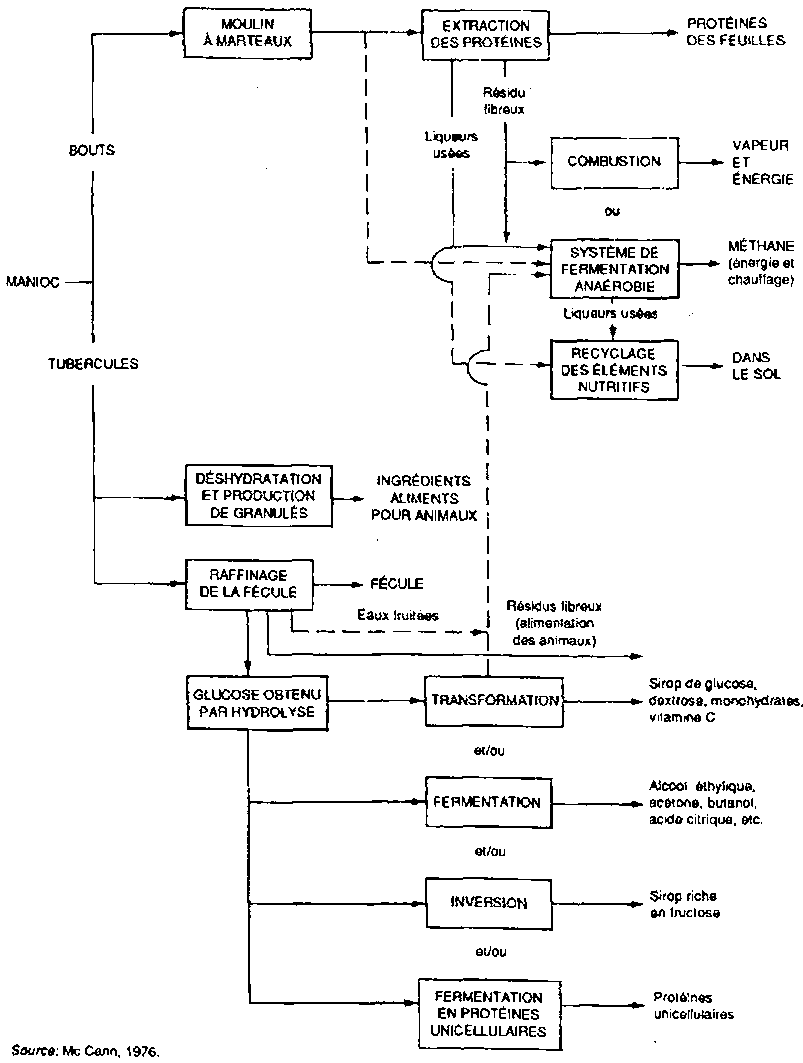 La fécule peut être hydrolysée en glucose et utilisée comme édulcorant. Les fécules provenant des plantes-racines sont souvent plus chères que celles tirées de céréales comme le riz ou le mais. L'augmentation de la production pourrait réduire les coûts de la fécule de racines et la rendre plus compétitive. La figure 8.1 présente sous forme de diagramme un exemple de système agro-industriel pour l'utilisation du manioc.