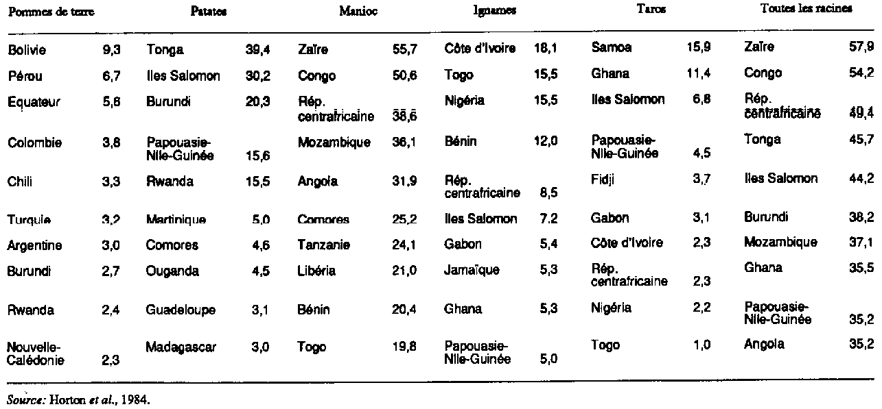 Les habitants du Samoa, dans le Pacifique Sud, tirent près de 16 pour cent de leur ration calorique de la consommation des taros (aracées), mais ces plantes-racines sont moins importantes en Afrique. Au Ghana, elles fournissent environ 11 pour cent des calories, alors qu'au Nigéria et en Côte d'Ivoire leur contribution ne représente que 2 pour cent environ de la ration calorique (tableau 3.4). En Amérique latine et dans les Caraïbes la production d'aracées a augmenté de moins de 1 pour cent par an entre 19691971 et 1982-1984 et n'a pas suivi la croissance démographique. De même, en Océanie, la croissance annuelle de la production d'aracées a été lente (1,3 pour cent) et, en Asie du Sud et du Sud-Est, elle a été négligeable ces dernières années.
