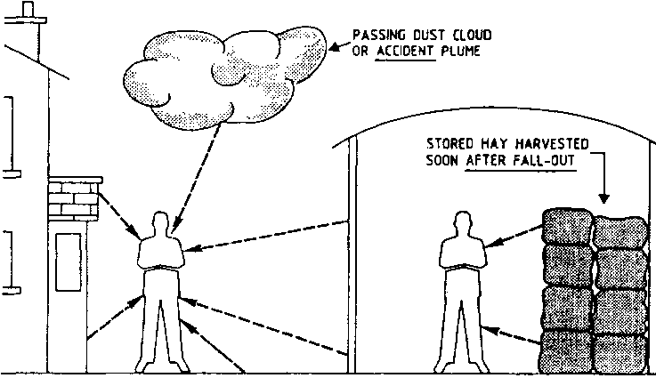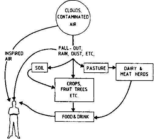 The principal pathways and sources of internal or external irradiation following an accidental release are illustrated diagrammatically in Figs 1, 2 and 3 which are self-explanatory. Figs 1 and 2 illustrate the role of agriculture and fisheries in the transfer of radioactive contaminants of agriculture, etc. to man. Fig. 3 illustrates the special problem of external radiation for the farming community who spend a great proportion of time working in the open. They may also be especially exposed to external irradiation from harvested and stored products, such as hay (16). The possible transfer of external radiation sources to urban communities in the form of non-food products (e.g. wool, cotton, pulp for paper and news print, timber etc.) is not illustrated. Likewise, 'the generally minor' pathway (124, p. 44; see Section 2.2.2 (d)) of radionuclide transfer by atmospheric re-suspension is not shown in Fig. 1.